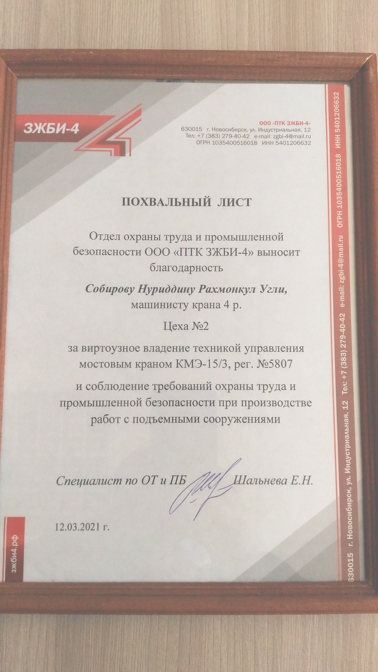 На днях торжественно был вручен похвальный лист и подписан приказ о материальном премировании крановщика мостового крана Собирова Нуриддина.